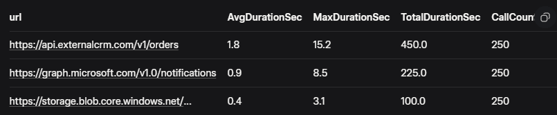 HTTP actions in Logic Apps often manifest as requests in App Insights, capturing URL, duration, and success metrics. But internal callbacks (e.g., webhook endpoints like /runtime/webhooks) clutter the view. This aggregation query excludes them, rolling up total, average, and max durations by URL—ideal for dependency SLAs.