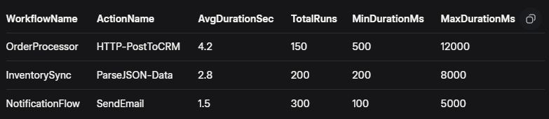 | project WorkflowName, ActionName, AvgDurationMs, TotalRuns, MinDurationMs, MaxDurationMs